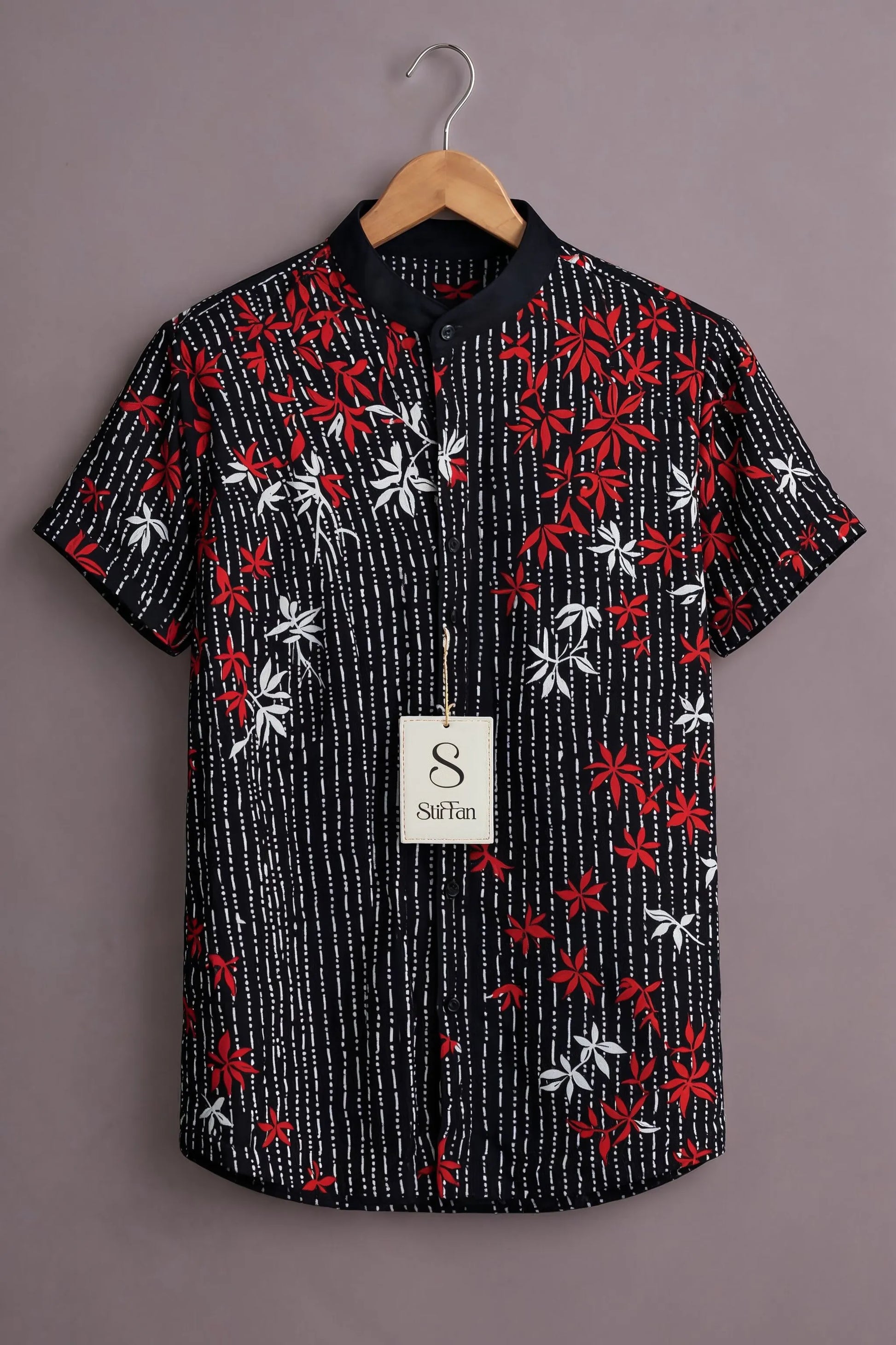 A bold fusion of contrast and character, the Midnight Red Blossom Shirt stands out with its deep black base layered with vertical textured dash stripes. Vibrant red and crisp white floral motifs bring energy and movement to the design, creating a powerful visual statement.