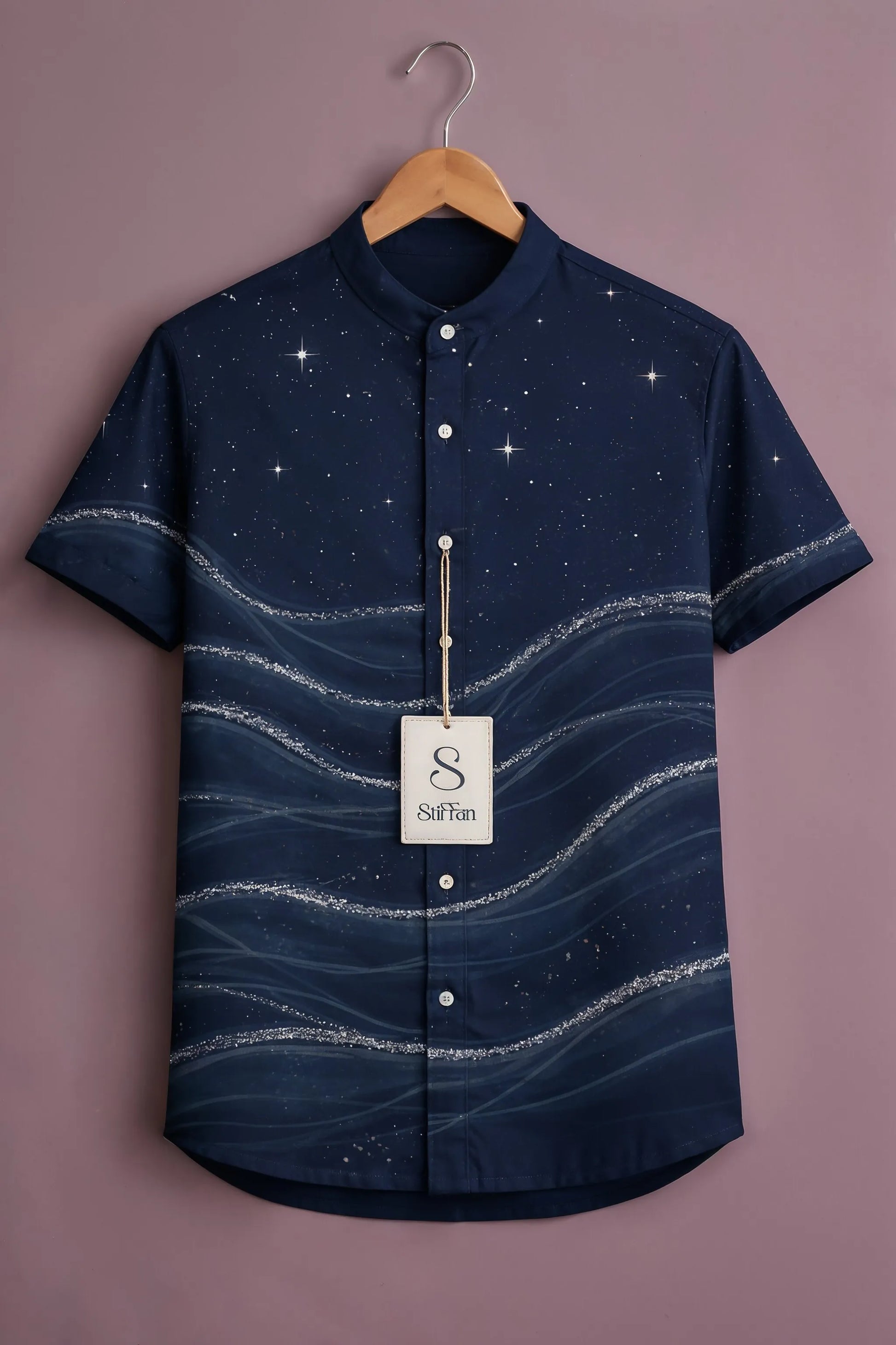 Inspired by the depth of a starlit sky, the Midnight Stardust Wave Shirt blends celestial elegance with modern structure. Crafted on a deep navy base, the shirt features scattered star detailing across the upper panel, transitioning into flowing silver wave accents that create a smooth, dynamic visual movement.