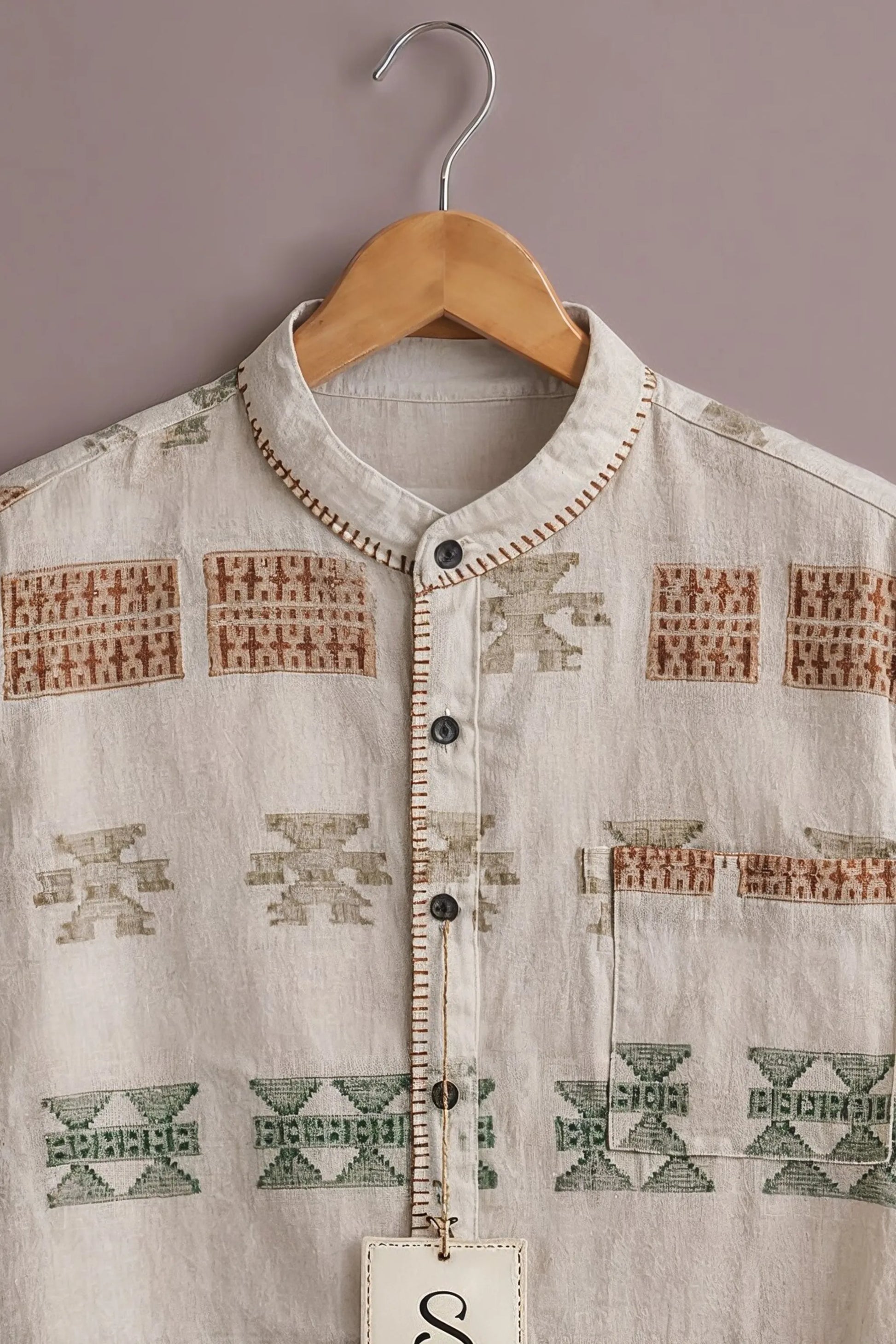 Rooted in tradition and refined with modern tailoring, this Desert Tribal Heritage shirt blends earthy tones with cultural patterns for a timeless ethnic appeal. Designed on a soft beige base, the geometric tribal motifs in muted rust and sage tones create a balanced, handcrafted aesthetic.