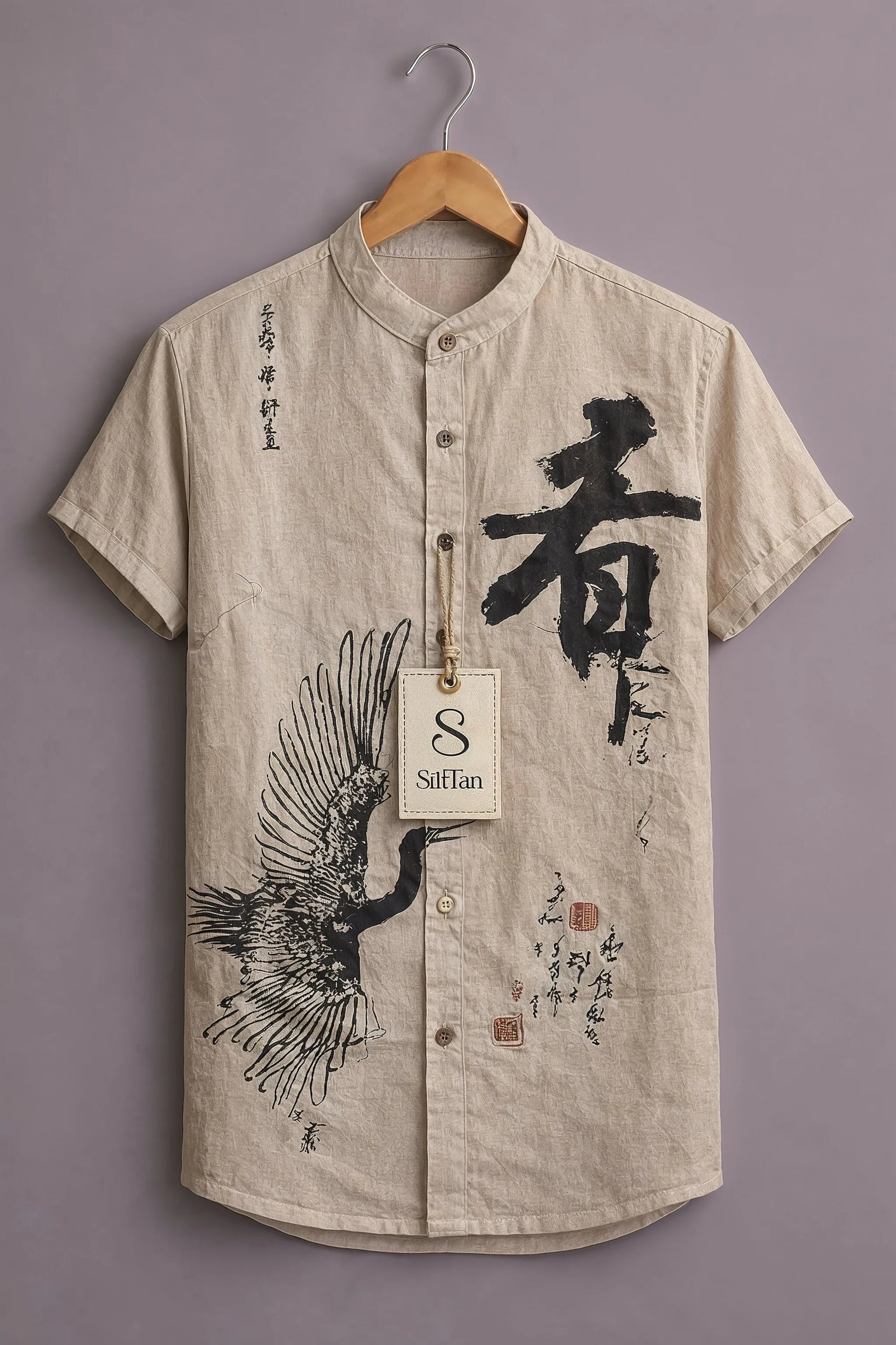 Rooted in traditional East Asian brush art, the Zen Crane Calligraphy Shirt blends cultural symbolism with modern tailoring. Crafted on a natural beige textured base, the bold black calligraphy stroke creates a commanding focal point, while the detailed flying crane illustration adds balance and movement.