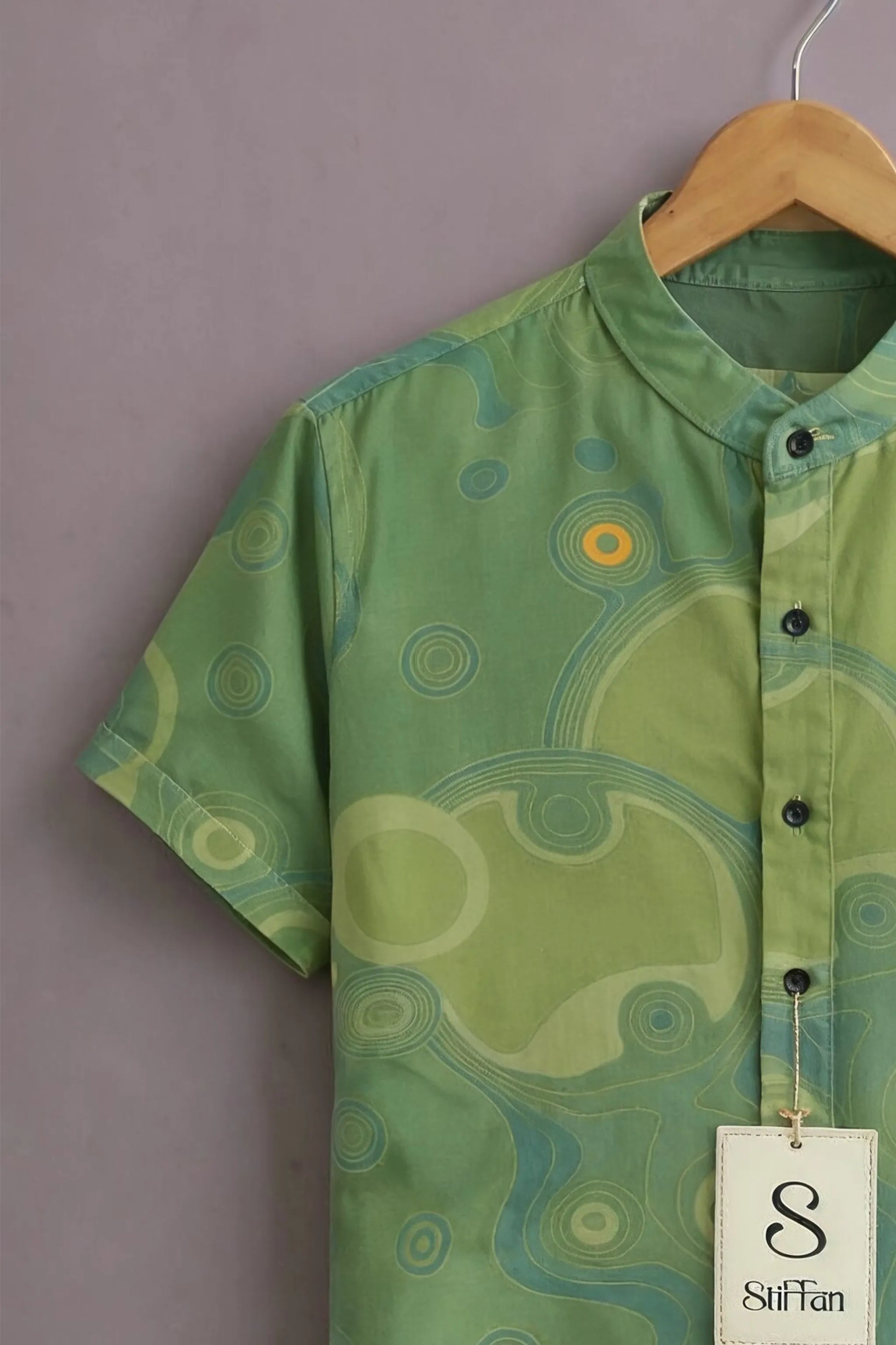 Bold yet fluid, the Neo Terra Abstract Shirt brings together layered green tones with organic circular wave patterns for a contemporary artistic look. The subtle contrast between sage, olive, and teal creates depth, while the soft contour-inspired print gives the shirt a dynamic movement effect.